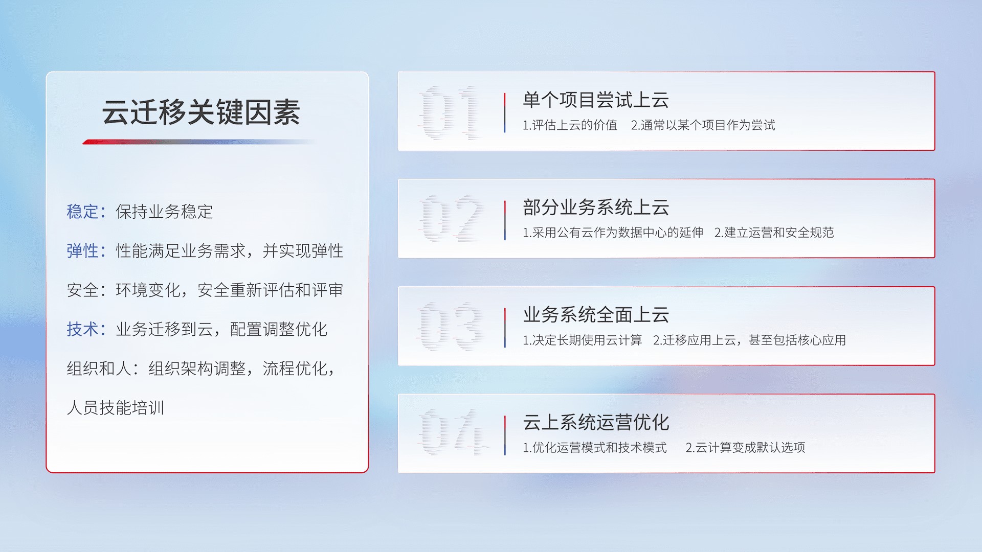 结合实际业务,,从规划设计、、、、云平台选型、、云原生改造、、、数据迁移、、集成交付,,迁移全过程为客户识别最佳上云路径,,,,做好风险识别管理,,,,设计网络架构、、、、身份权限、、安全审计合规、、、、操作审计、、日志审计、、、监控告警策略、、、多站点容灾设计等,,,对云上基础设施进行整体规划,,提升IT治理水平,,以满足弹性、、高可用、、、高性能的需求。。。。